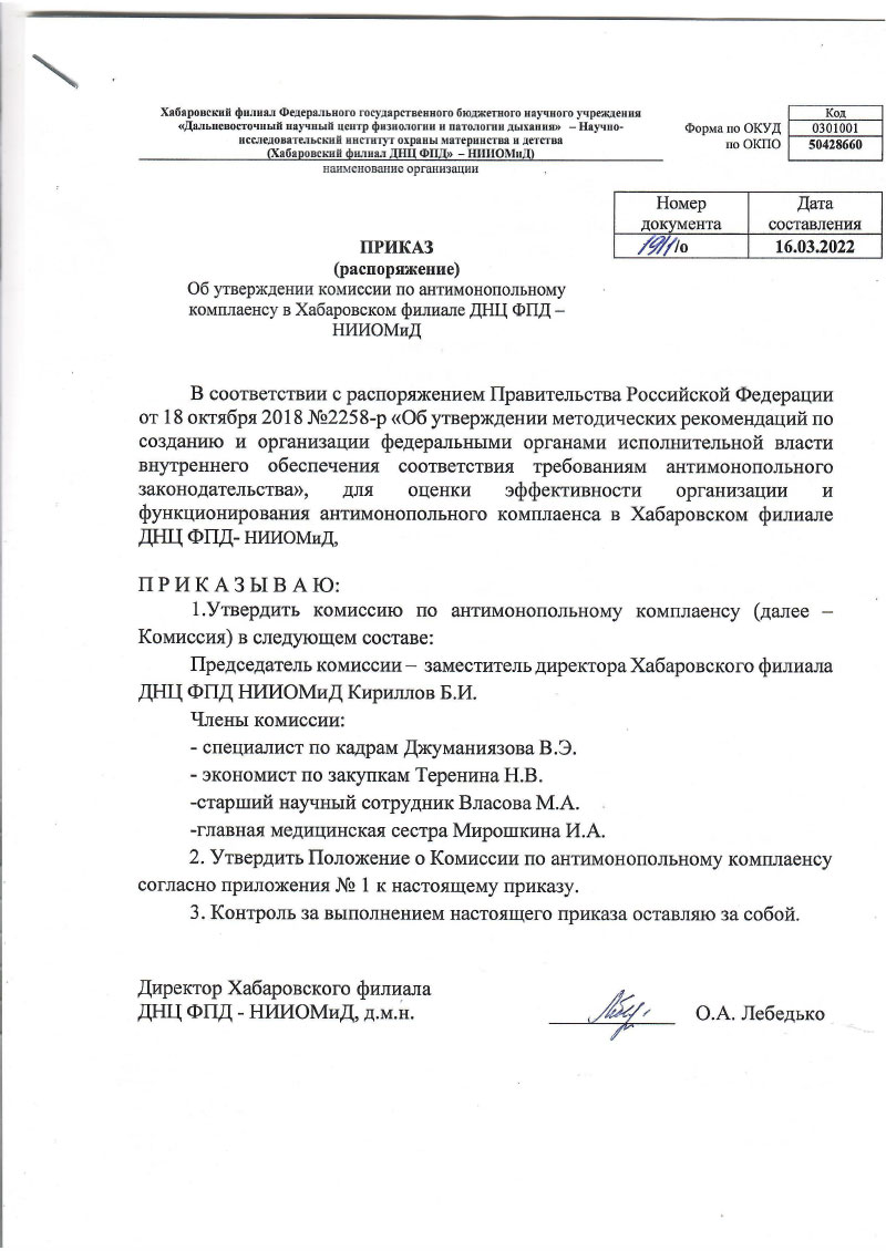 Образовательная организация: Хабаровский филиал Федерального государственного бюджетного научного учреждения «Дальневосточный научный центр физиологии и патологии дыхания» — Научно-исследовательский институт охраны материнства и детства (Сокращенное наименование: Хабаровский филиал ДНЦ ФПД — НИИОМиД).