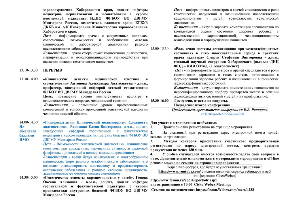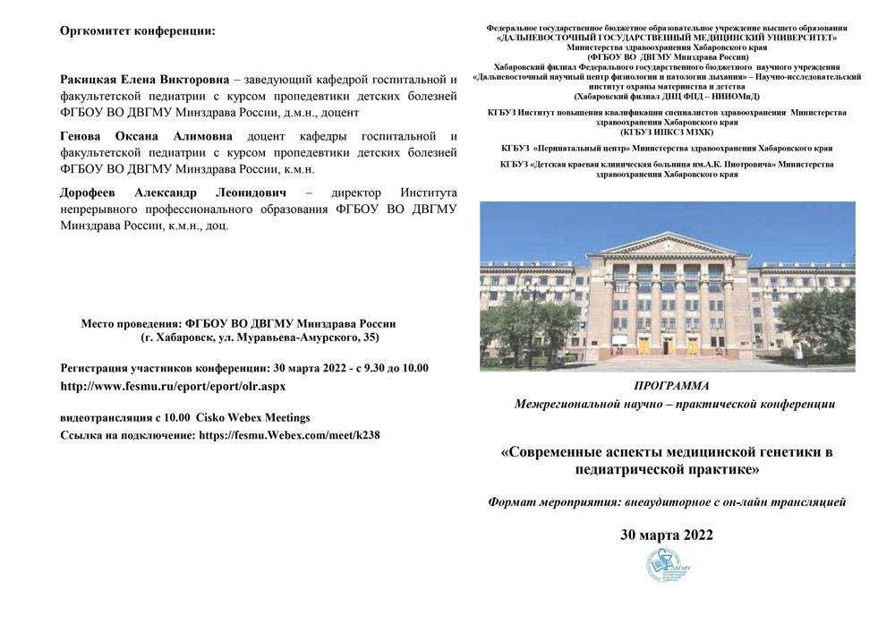 Новости 25 марта 2022 Приглашение на конференцию. Уважаемые коллеги! Приглашаем Вас 30 марта 2022 принять участие в Межрегиональной научно – практической конференции «Современные аспекты медицинской генетики в педиатрической практике» Формат мероприятия: внеаудиторное с он-лайн трансляцией+++