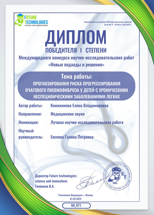 Очный аспирант Хабаровского филиала ДНЦ ФПД – НИИ ОМиД приняла участие в Международном конкурсе научно-исследовательских работ «Новые подходы и решения», где представила работу «Прогнозирование риска прогрессирования очагового пневмофиброза у детей с хроническими неспецифическими заболеваниями легких» и была награждена Дипломом победителя 1 степени.