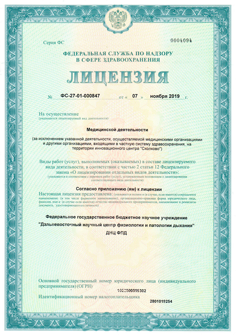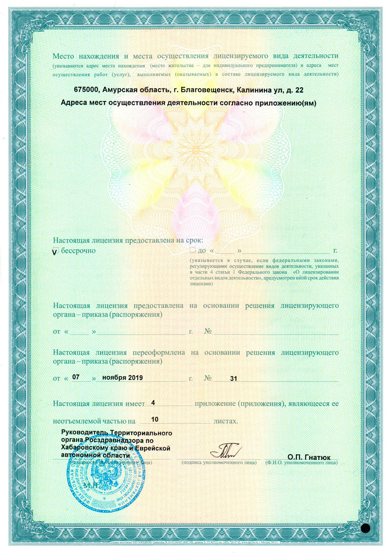 — Лицензию на осуществление медицинской деятельности № ФC-27-01-000847 от 07.11.2019 г.